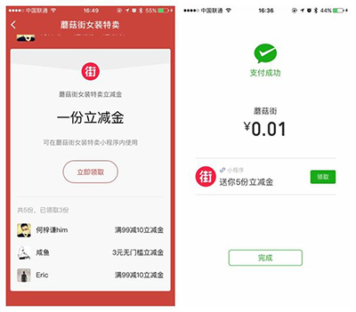 當用戶在小程序完成一筆支付之后,商家可利用小程序的社交立減金,引導用戶分享給下一位用戶,快速裂變新用戶,降低獲客成本。