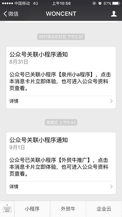 同一主體的小程序和公眾號(hào)可以進(jìn)行關(guān)聯(lián),并相互跳轉(zhuǎn),該功能需要經(jīng)開(kāi)發(fā)者自主設(shè)置后使用。通過(guò)公眾號(hào)查看并進(jìn)入所綁定的小程序一個(gè)公眾號(hào)可以綁五個(gè)小程序,但一個(gè)小程序只能被一個(gè)公眾號(hào)綁定。