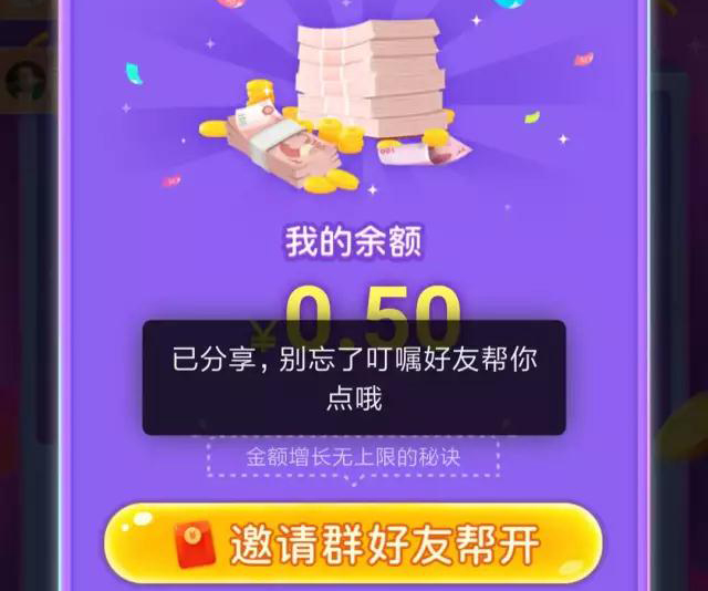 在「開紅包領(lǐng)錢」里,用戶點(diǎn)擊「邀請群好友幫開」分享小程序到群后,文案會(huì)提醒用戶「已分享,別忘了叮囑好友幫你點(diǎn)哦」。