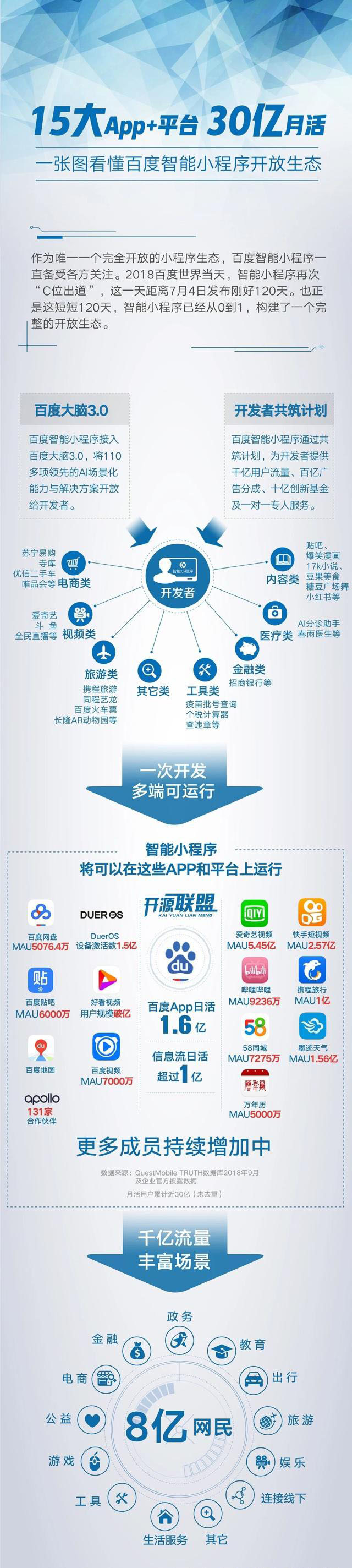 百度智能小程序已進(jìn)入全面爆發(fā)期,作為百度未來發(fā)展的重要戰(zhàn)略環(huán)節(jié),智能小程序目前已有超過15萬小程序入駐百度智能小程序生態(tài)圈,TP合作伙伴達(dá)200個,覆蓋271個行業(yè),實現(xiàn)了全場景覆蓋用戶需求。通過智能小程序,百度正在移動端構(gòu)建一個前所未有的新連接,實現(xiàn)從連接信息到連接商品與服務(wù)的升級。