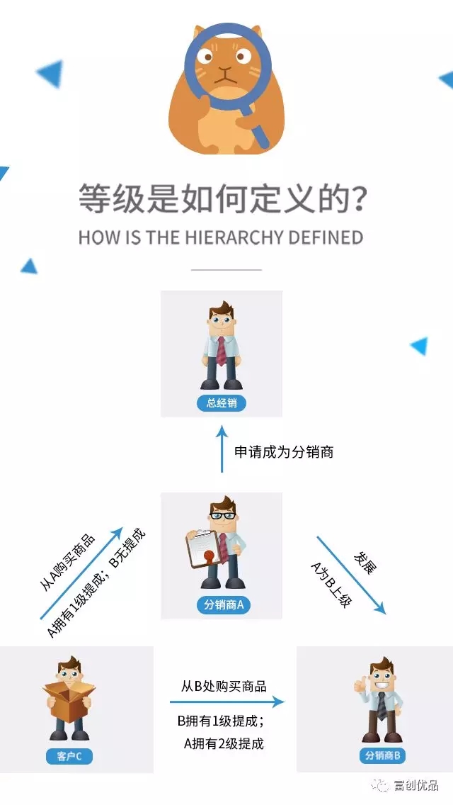 假如消費(fèi)者C,購買B的商品,則B為一級(jí)分銷商,A為二級(jí)分銷商;