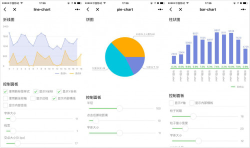 微信將組件封裝起來,形成一個完整的小程序,餅圖、折線圖、柱狀圖等多種圖表組件。這些圖表組件具有一定的模板化,但又給予了開發(fā)者充分的自由度。折線圖的坐標(biāo)軸、餅圖的半徑、柱狀圖的寬度等可以任意調(diào)節(jié)控制面板的各個參數(shù)。