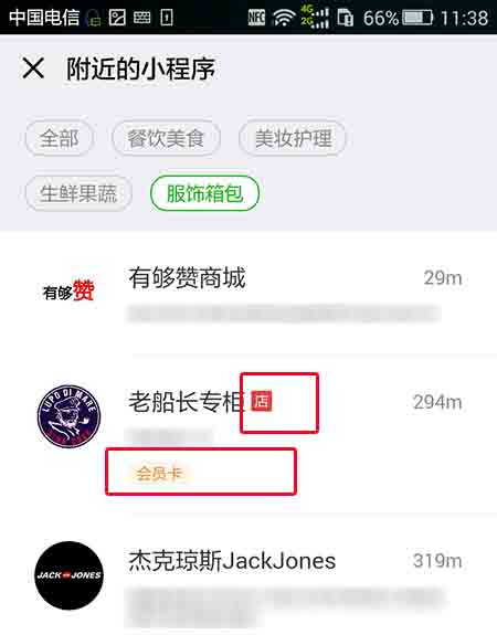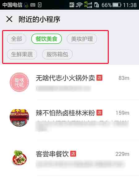 很多小程序名稱的后面都出現(xiàn)了紅色“店”字符的標(biāo)識,這應(yīng)該就是門店小程序+附近的小程序最終的合并形態(tài)了吧。